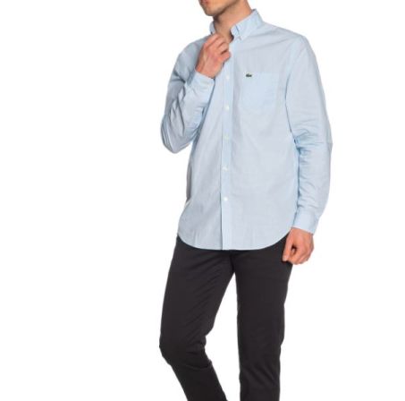 Camicia uomo maniche lunghe di Lacoste realizzata in cotone a trama fine, arricchita con bottoni in vera madreperla e un iconico coccodrillo verde di piccole dimensioni ricamato sul petto.