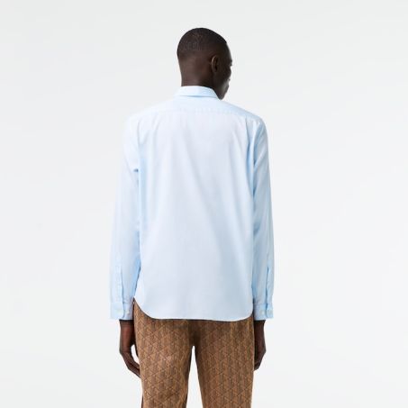 Camicia uomo maniche lunghe di Lacoste realizzata in cotone a trama fine, arricchita con bottoni in vera madreperla e un iconico coccodrillo verde di piccole dimensioni ricamato sul petto.