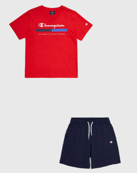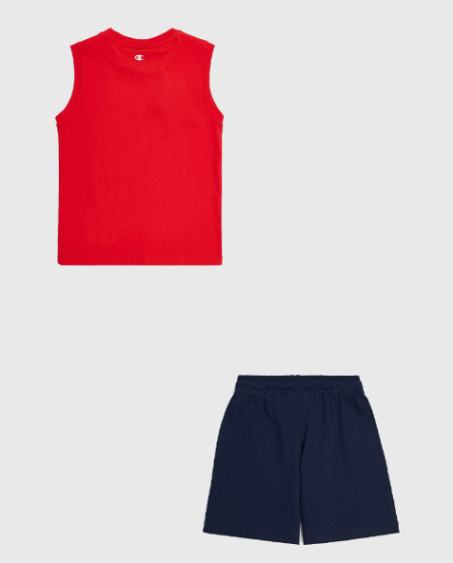 Completo Bambino Champion in cotone. Il modello, dalla vestibilità regolare, è costituito da canotta e pantalone corto. Ideale per un uso quotidiano e sportivo.