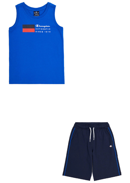 Completo Bambino Champion in cotone. Il modello, dalla vestibilità regolare, è costituito da t-shirt manica corta e pantalone corto. Ideale per un uso quotidiano e sportivo.
