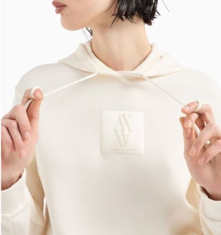 Felpa donna ARMANI AX, cappuccio in cotone. Realizzata con logo frontale, polsini e fondo a costine elasticizzato. Ideale per outfit casual e sportivi.