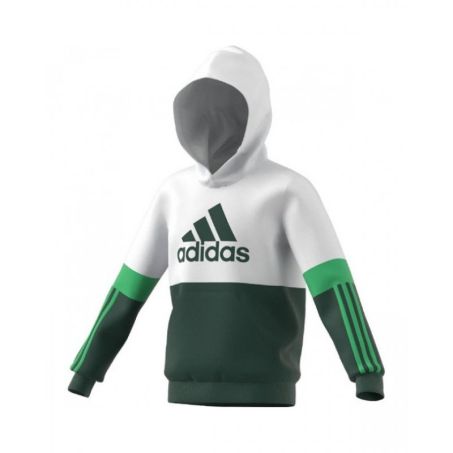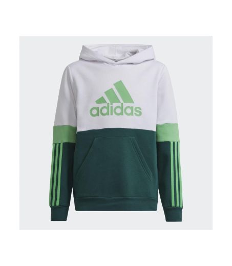 Felpa Junior Adidas Color Block Fleece con cappuccio, una tasca centrale a marsupio, logo grande sul petto e 3 strisce sulle maniche.