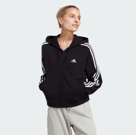 Felpa donna con cappuccio adidas in cotone. Dalla vestibilità ampia, full zip, due tasche frpntali e le tre strisce iconiche la rendono un capo ideale da indossare tutti i giorni.