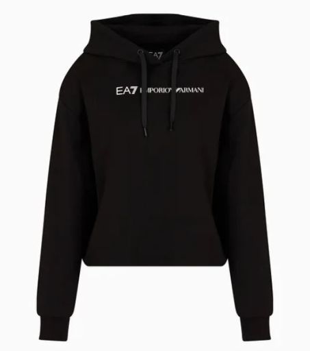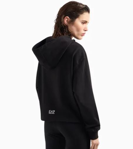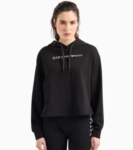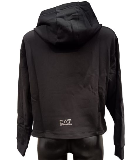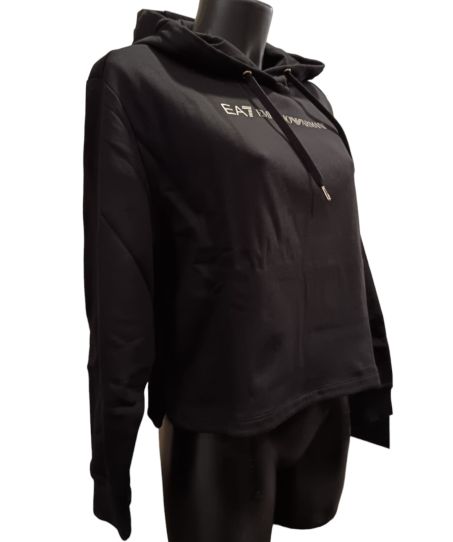 Felpa donna Ea7 Emporio Armani con cappuccio, vestibilità regular, modello cropped realizzato in cotone garzato con maxi logo frontale.
