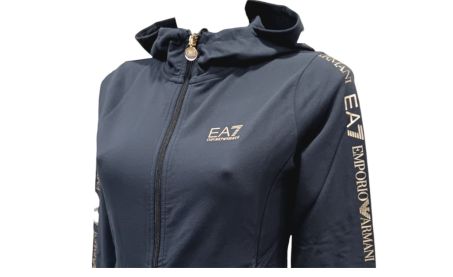 Felpa donna Ea7 Emporio Armani con cappuccio e zip. Il modello dalla vestibilità regular viene realizzato in cotone garzato, con fondo e polsi in maglia stretch e tasche laterali.