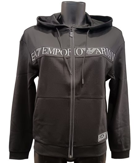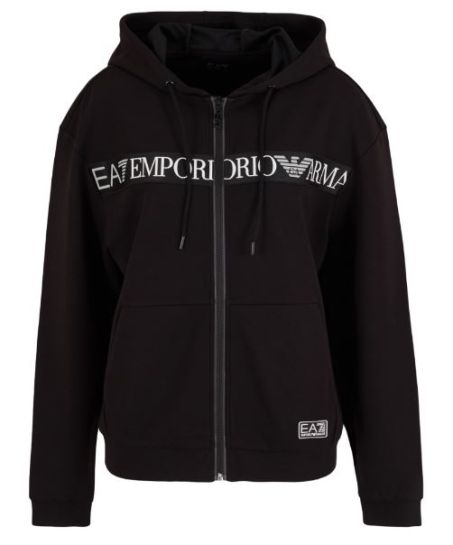 Felpa donna Ea7 Emporio Armani con cappuccio e zip. Il modello dalla vestibilità regular viene realizzato in cotone garzato, con fondo e polsi in maglia stretch e tasche laterali.