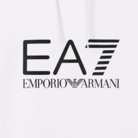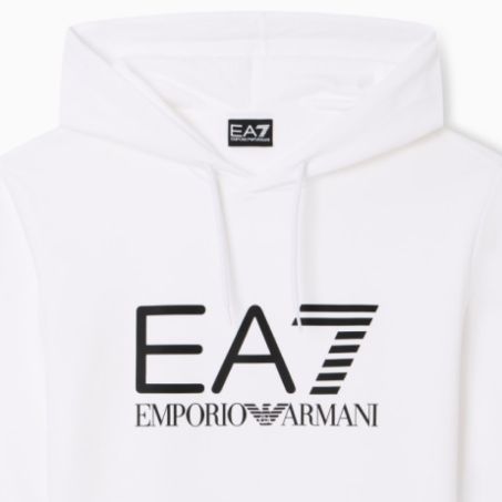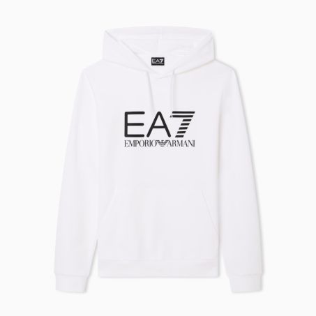 Felpa con cappuccio EA7 in morbido cotone dal design pulito, con maxi logo a contrasto sul petto. Ideale per look sportivi e tempo libero, unendo comfort e stile.