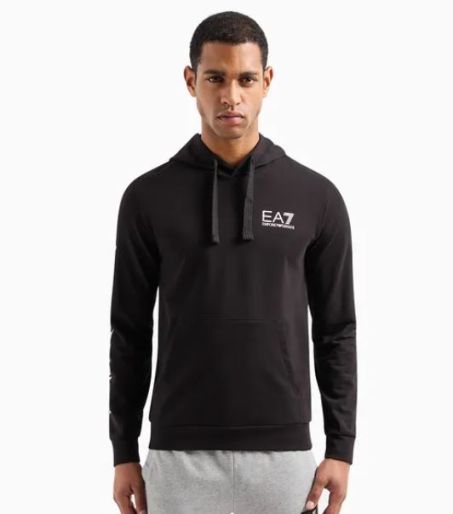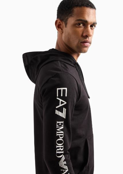Felpa da uomo Ea7 Emporio Armani, realizzata in cotone garzato con cappuccio, fondo e polsi in maglia stretch e tasca frontale. Il modello dalla vestibilità regular presenta un logo a contrasto sul petto e sulla manica.
