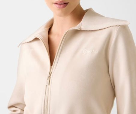 Felpa Guess in velluto con chiusura in zip e un particolare collo a cratere. Il modello è arricchito dal logo guess ricamato