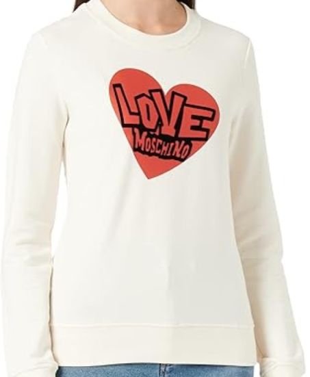 Felpa da donna girocollo Love Moschino, in tinta unita con grande logo stampato sul frontale in cuore, realizzata in fresco cotone, l'indumento ideale per le tue passeggiate fuori porta.