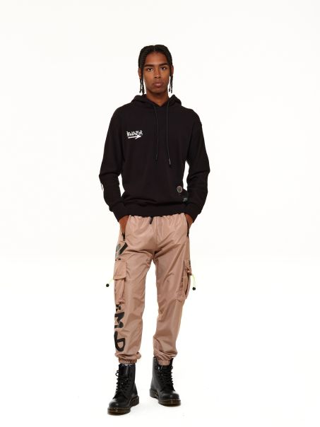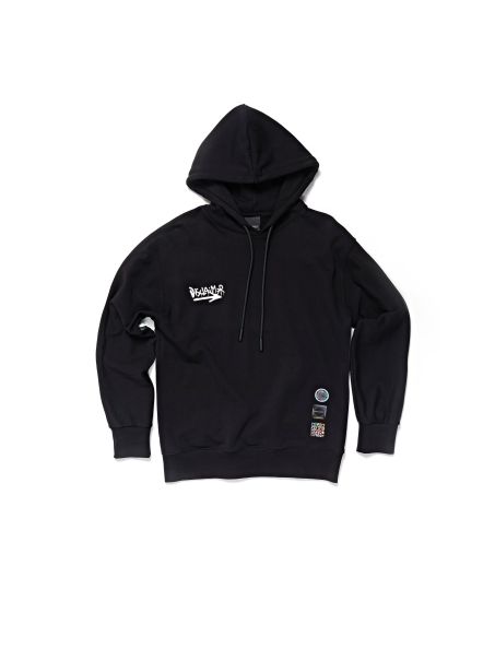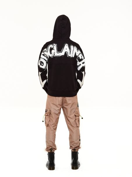 Felpa uomo Disclaimer cappuccio e applicazione logo e stampa sul davanti e sul retro.