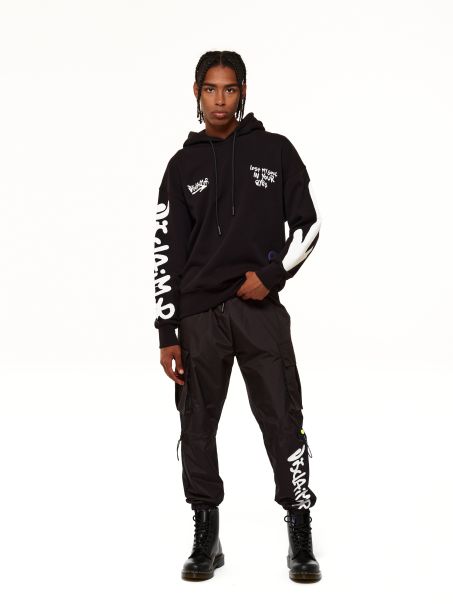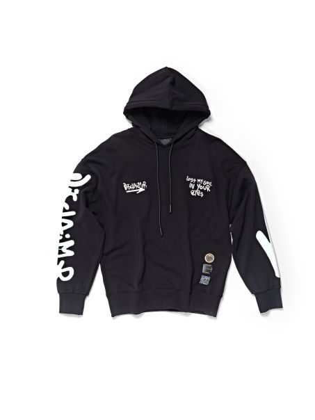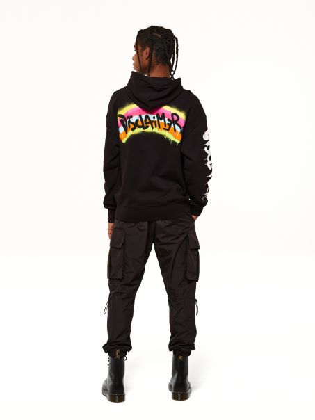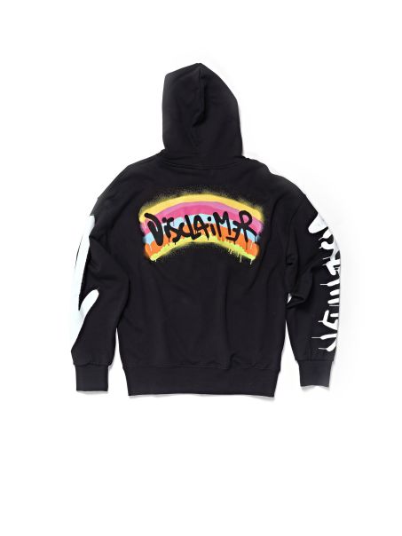 Felpa uomo Disclaimer cappuccio e applicazione logo e stampa sul davanti e sul retro.