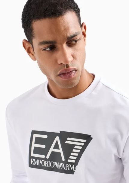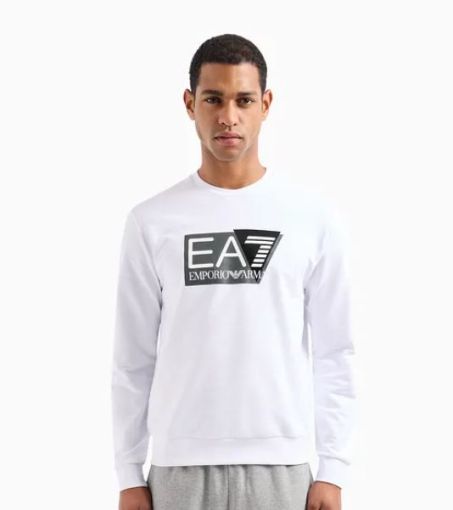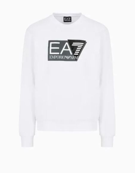 Felpa uomo girocollo di EA7 Emporio Armani realizzata in morbido cotone, dalla vestibilità regular, personalizzata dal maxi logo EA7 stampato a contrasto sul petto.