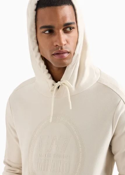 Felpa di EA7 Emporio Armani con cappuccio realizzata in misto cotone organico, pratica tasca frontale a marsupio, personalizzata dal logo EA7 con effetto gommato applicato in tono sul petto.