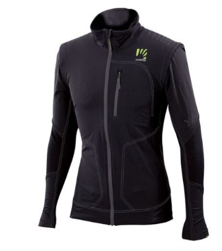 Giacca in K-Shell DEFENCE EVO di KARPOS tessuto elastico e traspirante, rinforzato in Cordura .Stampa in silicone, maniche staccabili, due tasche davanti chiuse con zip minimal e coulisse al fondo capo regolabile.