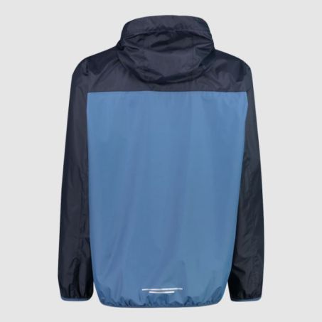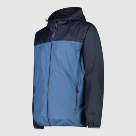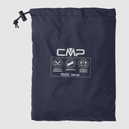 Giacca CMP Campagnolo in poliestere idrorepellenti, ripiegabile nella tasca laterale. Vestibilità larga, elastico in vita e zip sul fondo.
