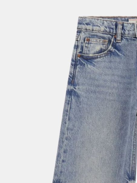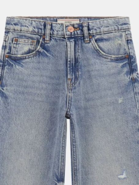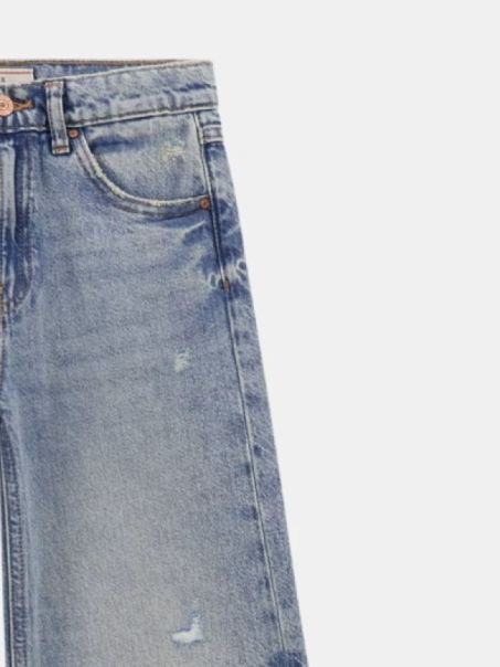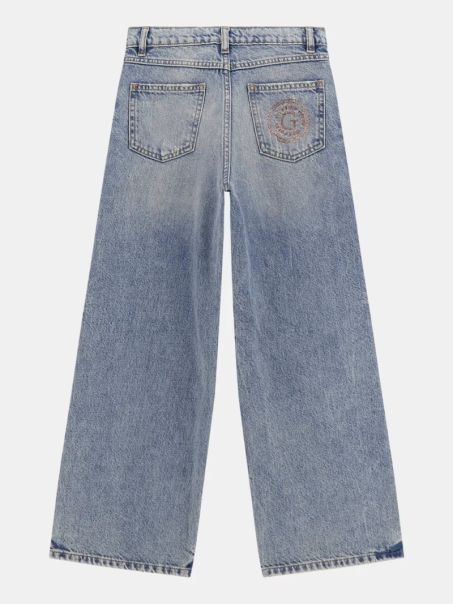Jeans da bambina in cotone con classico modello 5 tasche. Vita alta e gamba ampia per una comoda vestibilità palazzo. Chiusura con cerniera lampo e bottoni, perfetti per look moderni e pratici.