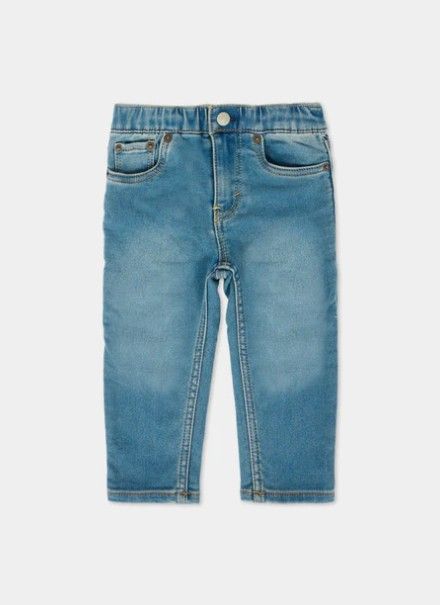 Jeans denim cinque tasche, con vita elasticizzata e chiusura frontale con zip e gancio. Sono decorati con patch logato sul retro.