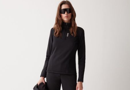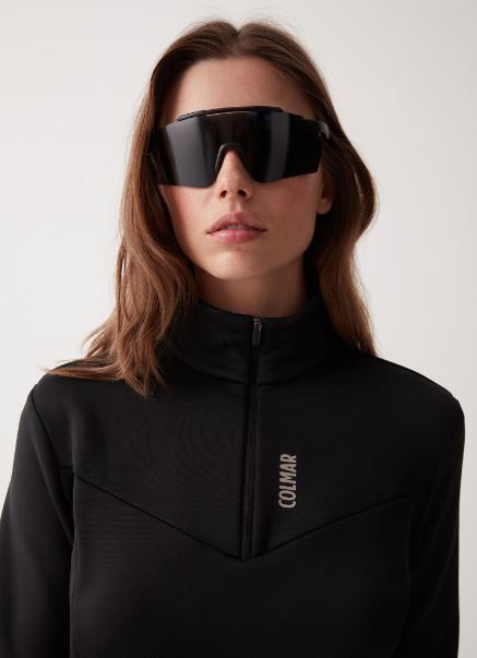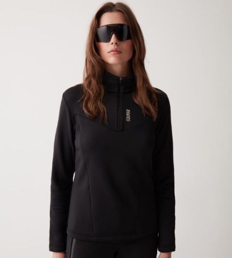 Maglia termica di Colmar da donna mezza zip realizzata in pile stretch liscio all'esterno, tessuto strech e logo Colmar.