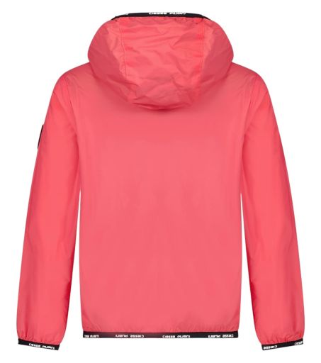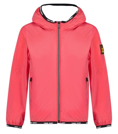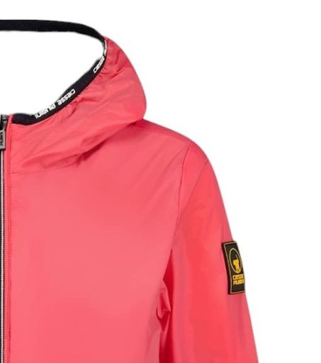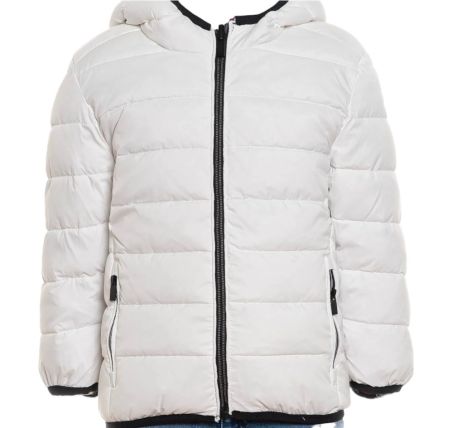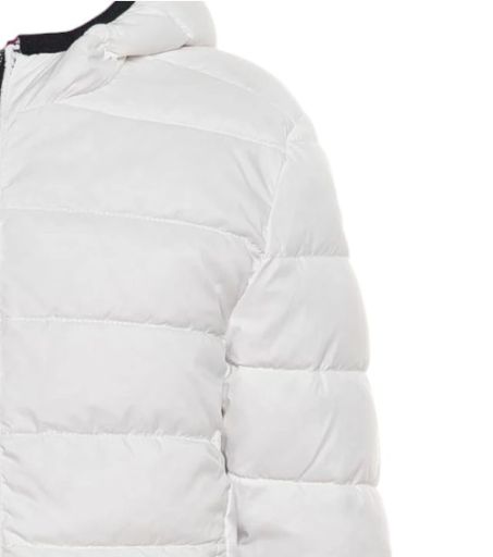 Giacca a vento in nylon lucido milky fuori, elegante piumino dentro, impermeabile e traspirante, con cappuccio, zip centrale a contrasto, tasche con zip, polsini, fondo e cappuccio elasticizzati logati.