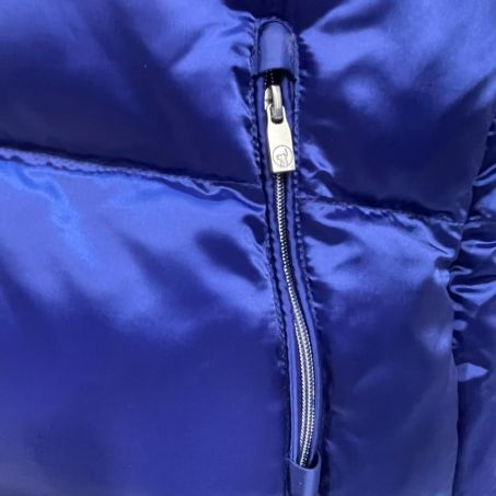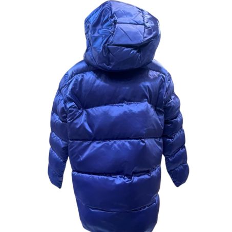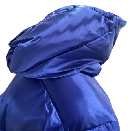 Piumino lungo blu elettrico in nylon metallico lucente, linea svasata con zip laterali, cappuccio removibile, maxi trapuntatura e imbottitura ecologica dal volume moderno.