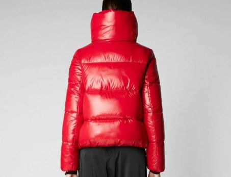 Piumino Save The Duck Donna slim fit, finitura laqué del tessuto esterno. Morbida imbottitura 100% ANIMAL FREE e maxi logo nero.