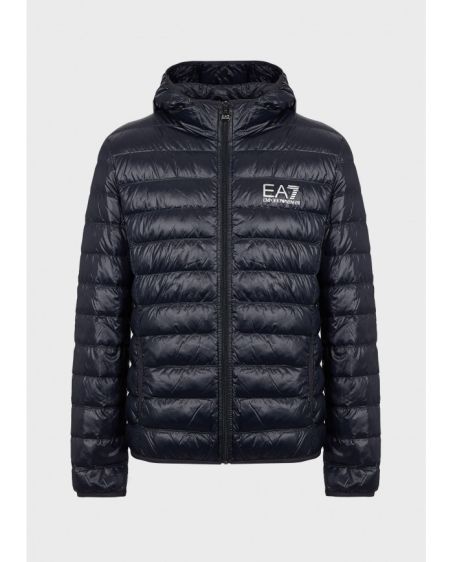 Piumino EA7 Emporio Armani con imbottitura in piuma, chiusura full-zip, stampa grande frontale con logo EA7 sul petto. Due tasche esterne e due interne, sacchettino porta piumino incluso.