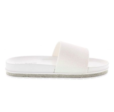 Ciabatte da donna di Laura Biagiotti con fascia larga ricoperta di strass, morbido plantare sagomato, suola in gomma.