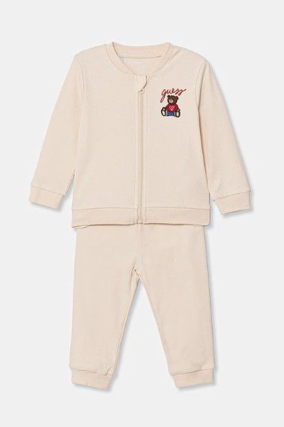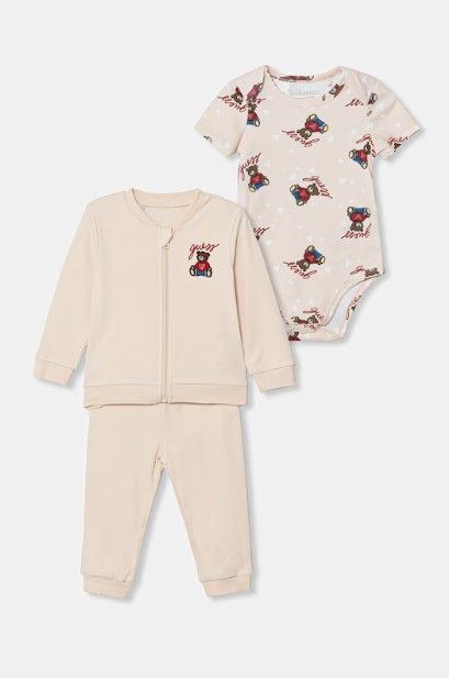 Set GUESS bambini composto da tre pezzi: felpa logata con orsachiotto, pantalone comodo e body interamente logato guess