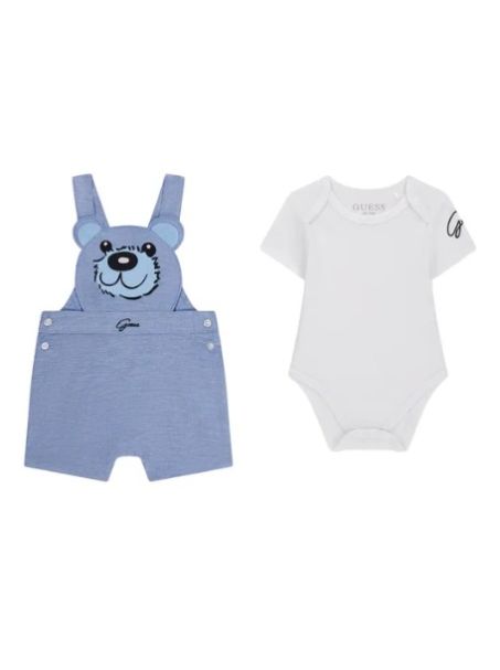 Set Guess bambino composto da due pezzi: un bodt a girocollo a manica corta e una salopette azzurra a forma di orsacchiotto