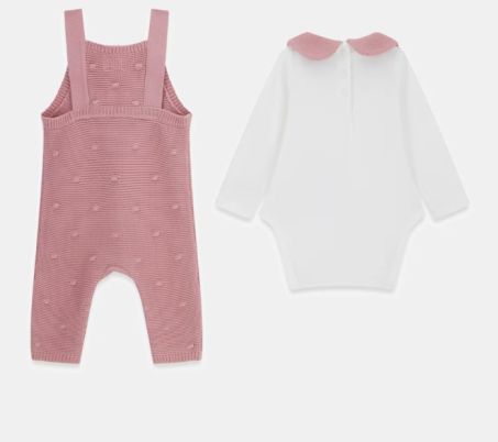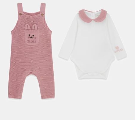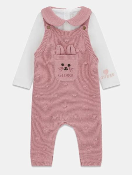Set 2 pezzi Guess in jersey formato da body con colletto a Peter Pan a maniche lunghe e salopette con bretelline regolabili e tasca frontale. Chiusura posteriore con bottoni.