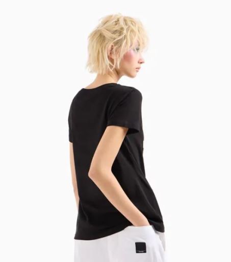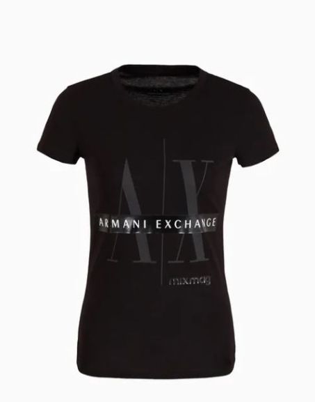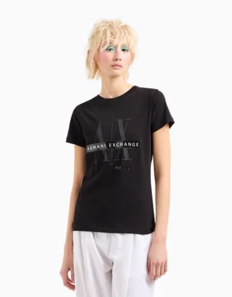 T-shirt donna di AX Armani Exchange realizzata in cotone vestibilità slim fit, maniche corte, girocollo e maxi stampa sul davanti.