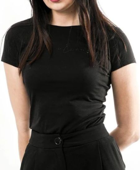 T-shirt realizzata in morbido jersey di cotone, il capo iconico che unisce comfort e uno stile distintivo. Protagonista è l'elegante logo frontale con scritta calligrafica, impreziosito da dettagli luminosi.