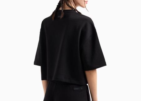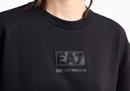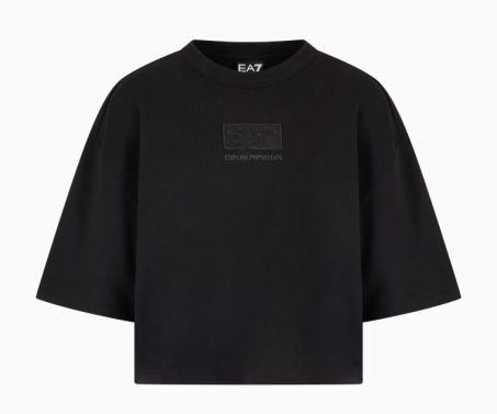 T-shirt donna di Ea7 Emporio Armani girocollo dal taglio cropped, realizzata in morbido misto cotone. Il modello è personalizzato dal luminoso logo EA7 sul petto, realizzato con strass e cristalli silver.