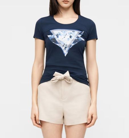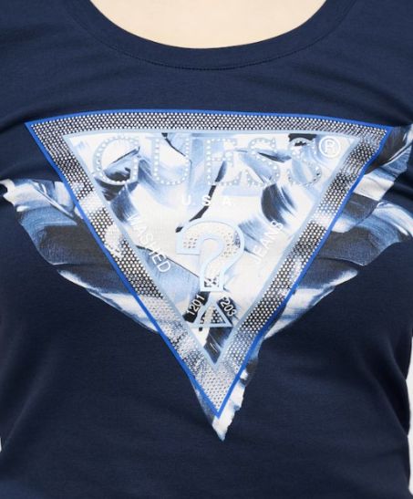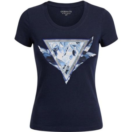 Questa t-shirt Guess si distingue per l'iconico logo a triangolo frontale, arricchito da una sofisticata stampa a motivi floreali nei toni dell'azzurro