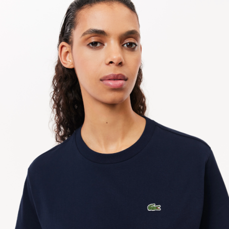 T-Shirt donna Lacoste morbidissima in jersey realizzata in meraviglioso cotone Pima. Un vero e proprio must-have, caratterizzato da un taglio rilassato fatto apposta per muoversi insieme te e arricchito da un colletto a costine. Comfort estremo.