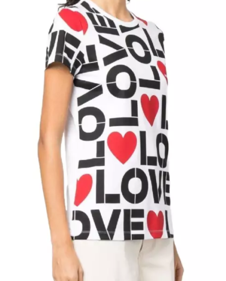 T-Shirt donna girocollo Love Moschino, realizzata in cotone, con cuori e scritte "LOVE" su tutta la parte anteriore. Logo all'interno di un cuore sulla spalla sinistra. Elegante ma allo stesso tempo comoda e versatile, adatta ad ogni tipo di occasione.