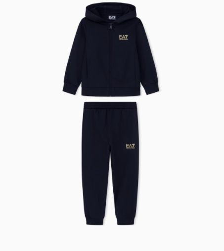 Tuta EA7 bambino che si compone di una felpa con cappuccio e chiusura con zip e un pantalone jogger. Entrambi i capi presentano il logo EA7. Due capi che possono essere indossati anche separatamente