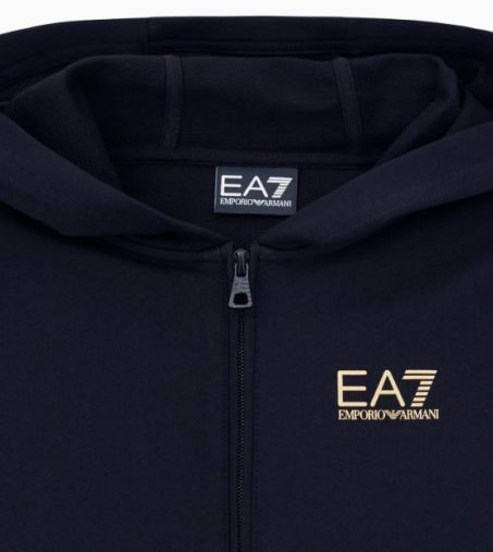 Felpa con cappuccio, chiusura con zip, due tasche laterali, logo EA7 a contrasto sul petto e dettagli in maglia elasticizzata