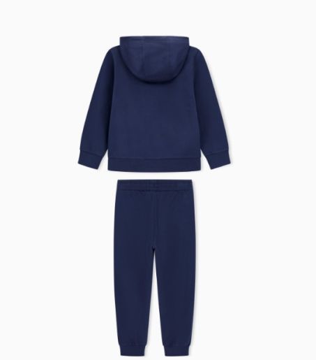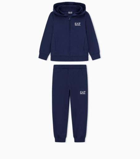 Tuta EA7 bambino che si compone di una felpa con cappuccio e chiusura con zip e un pantalone jogger. Entrambi i capi presentano il logo EA7. Due capi che possono essere indossati anche separatamente