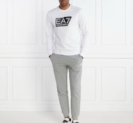 Tuta uomo di EA7 E mporio Armani composta da una felpa girocollo abbinata a un pantalone jogger con coulisse e tasche laterali.