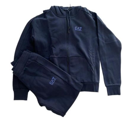 Tuta EA7 Emporio Armani in morbido cotone felpato, composta da felpa con cappuccio e zip con tasche e pantaloni con coulisse in vita, tasche e fondo caviglia elasticizzato.