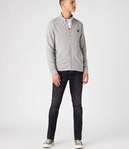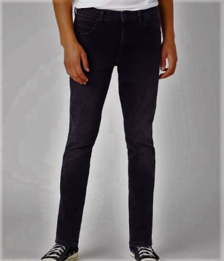 Jeans Wrangler modello Larston 812 vestibilità slim, vita regolare e la patta con zip e dal fondo gamba affusolato.