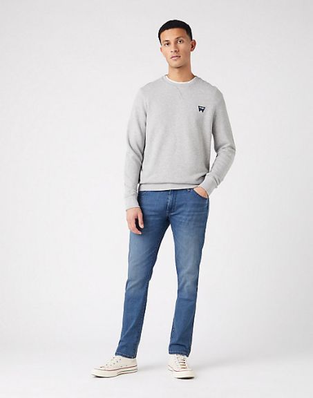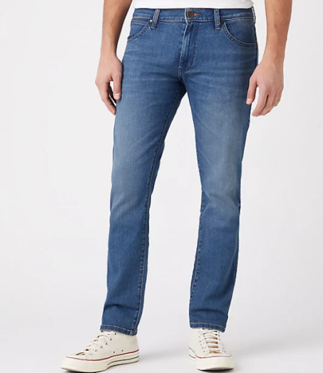 Jeans Wrangler modello Larston 812 vestibilità slim, vita regolare e la patta con zip e dal fondo gamba affusolato.